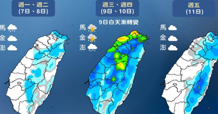 氣象署指出,週一、週二西半部山區、東半部、恆春半島有局部短暫雨,北部亦有零星短暫雨;週三白天鋒面接近,一早各地尚穩定,東半部及恆春半島有局部降雨,隨著鋒面發展接近,北部先開始轉為局部短暫陣雨或雷雨的天氣,中部、南部山區也逐漸轉為有局部短暫陣雨或雷雨。