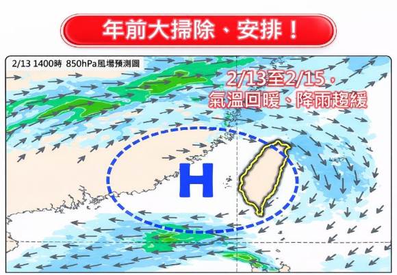 吳聖宇分析,週五(13日)起到週末(14、15日)的天氣將持續維持穩定型態,各地大致為晴到多雲,僅花東有零星降雨的機會,北部、東北部白天高溫將逐漸回升到25-27度,臺北市有可能來到28度或以上,而南部及花東白天高溫也將逐漸回升到26~29度,甚至高屏一帶有機會來到30度或以上,很適合做年前的大掃除以及過年的準備工作。