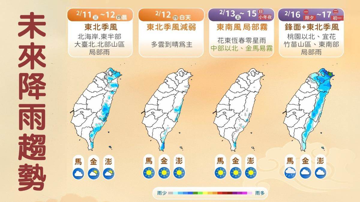 吳聖宇提到,這波東北季風大約持續到明天清晨,明白天東半部地區雲量仍較多,偶有零星區域性短暫陣雨,西半部則是多雲到晴的天氣,宜蘭花蓮一帶白天高溫約在20度上下,仍有些涼意,北部的苗栗到大臺北一帶高溫將回升到22至23度,中部及臺東地區高溫24至26度,而南部高溫仍可達27度或以上。
