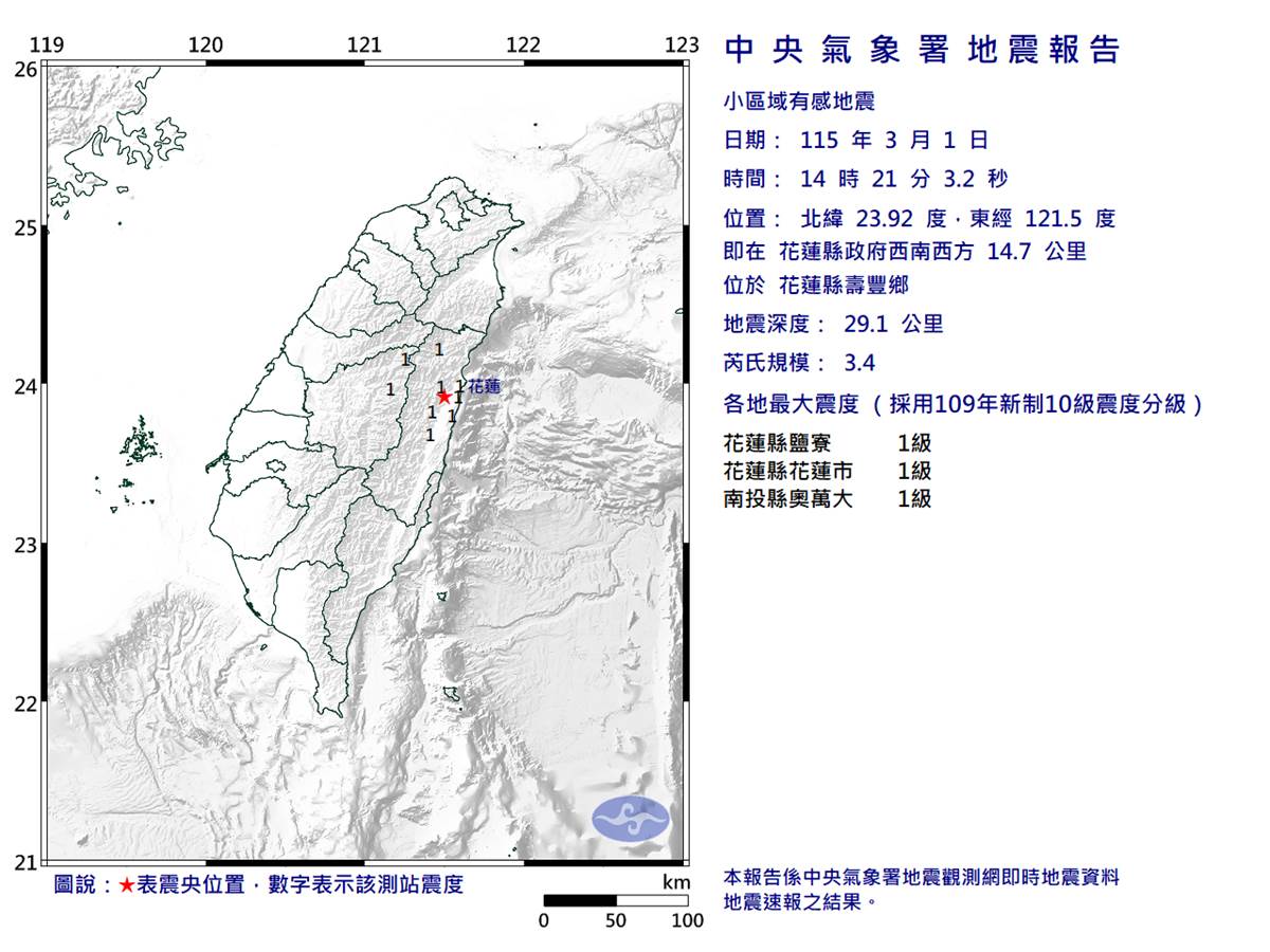 根據中央氣象署地震觀測網即時資料顯示,這起地震發生于2026年3月1日14時21分03秒,震央位于北緯23.92度、東經121.5度,位于花蓮縣壽豐鄉,距離花蓮縣政府西南西方約14.7公里處。地震深度為29.1公里,屬于「極淺層地震」。