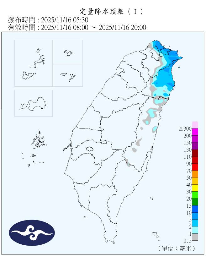 氣象署預測,週二、週三中部以北及宜蘭低溫15~16度,南部、花東及澎湖18~20度;北部及宜蘭高溫18~20度,中南部及花東22~29度。