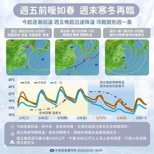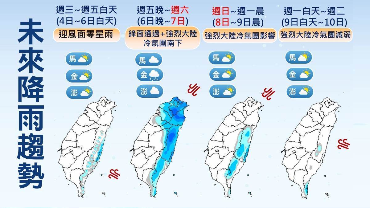 吳德榮續稱,週六中部以北轉濕冷有雨,且越晚越冷。下週日、一(8、9日)各地寒冷,下週日北部轉多雲,中南部晴朗,東半部有區域性短暫雨;下週一各地晴朗穩定,東半部偶有零星短暫降雨。