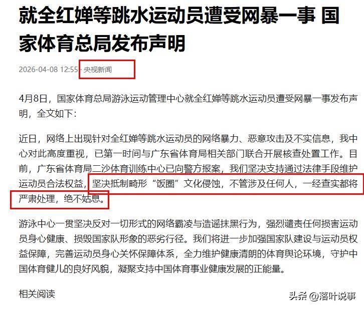 4月8日,事件迎來最重磅的後續:廣東省二沙體育訓練中心正式釋出宣告,就全紅嬋長期遭受集體網路暴力一事,已向公安機關報案,