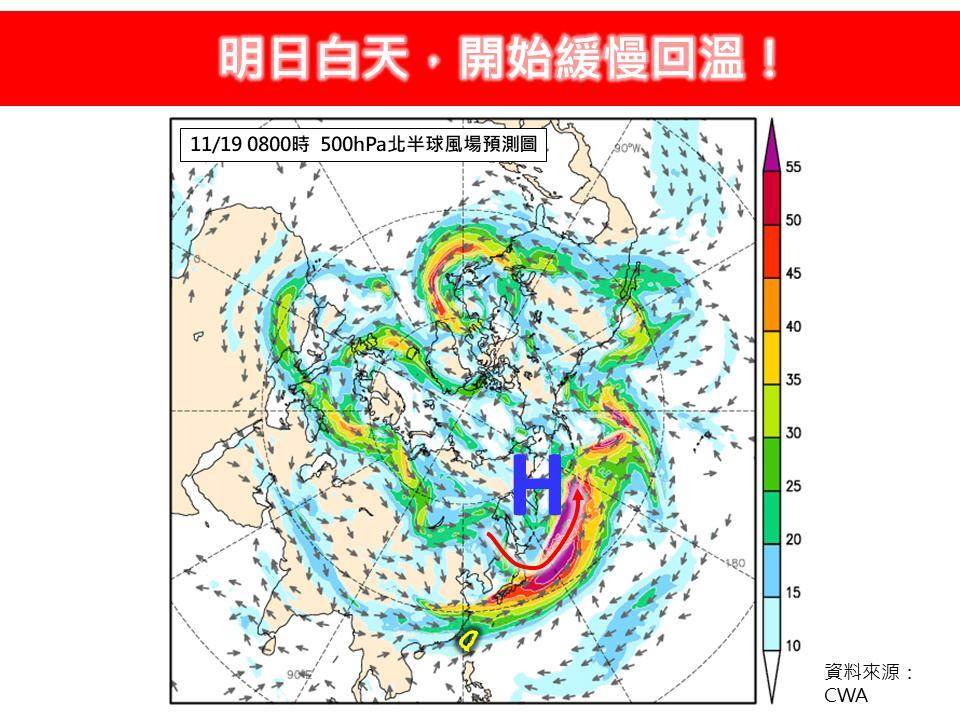 針對何時回溫?林得恩則分析,白天北台灣氣溫回升不明顯,仍停留在攝氏16至18度之間;其它地區白天稍稍回溫,有機會重登到攝氏20度或以上,尤其是南部地區高溫可以來到攝氏25至27度,提醒民眾注意南北溫差恐達攝氏10度以上。