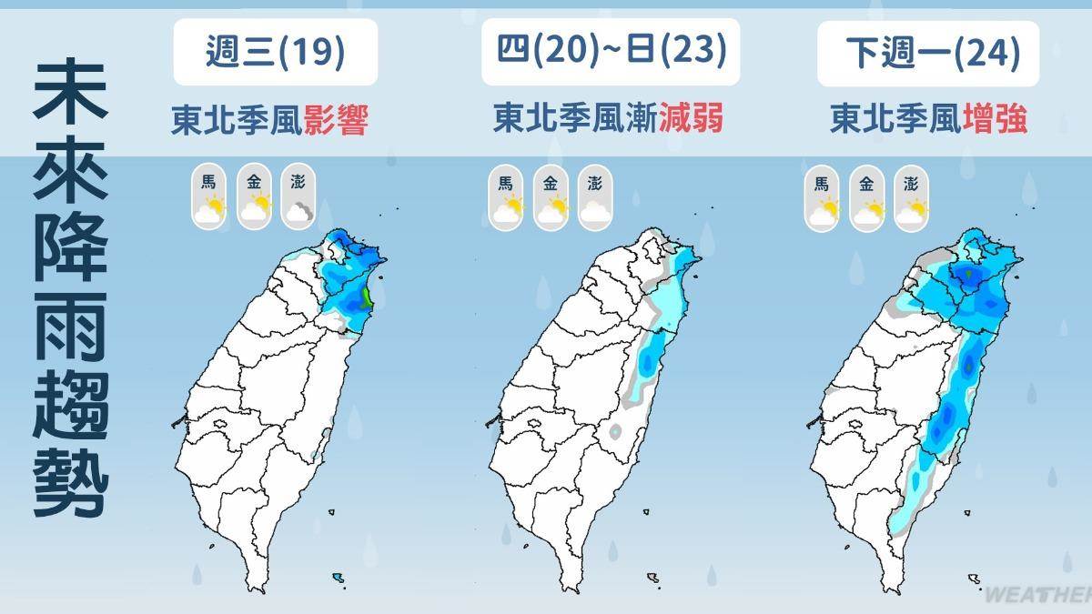 至于一週天氣,吳德榮表示,依最新模式模擬顯示,週五至下週日(21至23日)迎風面仍有水氣,北海岸、東北部偶有區域性短暫雨的機率,背風面晴朗穩定;週五、六北臺偏涼,中南部白天舒適、早晚涼;下週日東北季風減弱,各地氣溫回升。下週一(24日)下一波東北季風南下,迎風面降雨機率略提高,北臺氣溫下降。下週二(25日)水氣減少,各地晴朗穩定、早晚很涼。