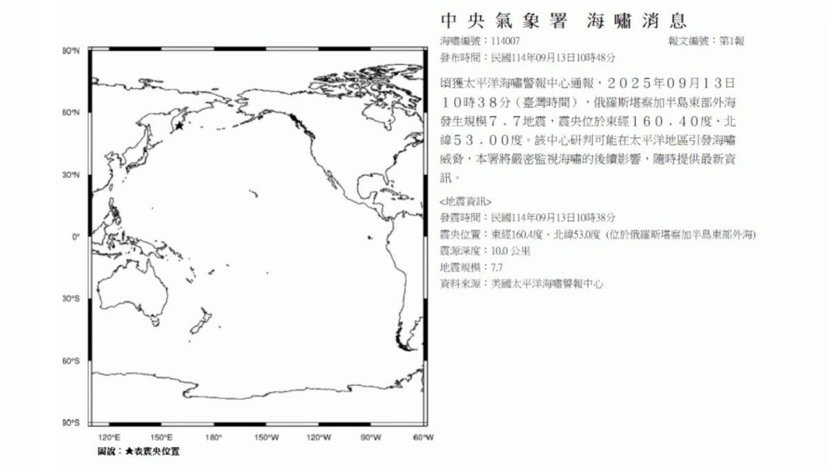 中央氣象署今(13)日上午 10 時 48分 發布海嘯消息,指出接獲太平洋海嘯警報中心通報,台灣時間今天上午 10 時 38 分,俄羅斯堪察加半島東部外海發生規模7.7地震,震央位于東經 160.40 度、北緯 53.00 度。提醒太平洋地區引發海嘯威脅,氣象署將嚴密監視海嘯的後續影響,隨時提供最新資訊。