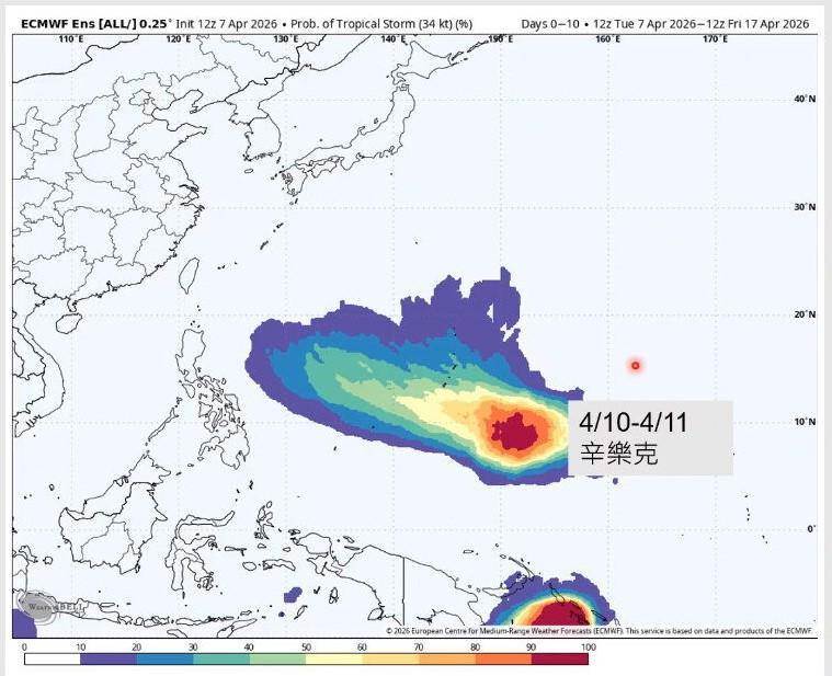 今年第4號颱風辛樂克的生成機率持續攀升,氣象專家賈新興評估,週四晚間至週五于關島東南方附近,辛樂克颱風有逾七成機率正式命名,路徑預估初期往西北朝菲律賓東方海面推進,後續可能轉向琉球群島方向。