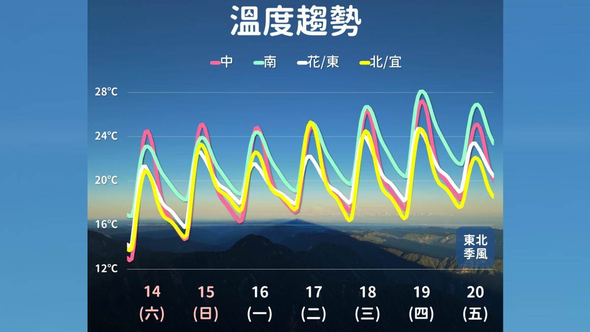 下周一、下週二東風帶來較多水氣,基隆北海岸、大臺北山區、東半部及恆春半島將有零星短暫雨,西半部則維持晴到多雲天氣。