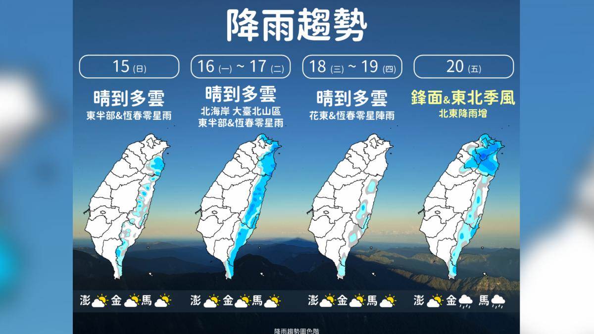 氣象署進一步說明,下週三、下週四風向進一步轉為偏東南風,花蓮、臺東、恆春半島以及竹苗山區仍有零星降雨機會,其餘地區多為多雲到晴。到了下週五,鋒面南下並伴隨東北季風增強,北部與東半部降雨機率將明顯提高,包括桃園以北、東半部及恆春半島都有降雨機會,竹苗山區也可能出現區域性降雨,天氣再度轉趨不穩定。