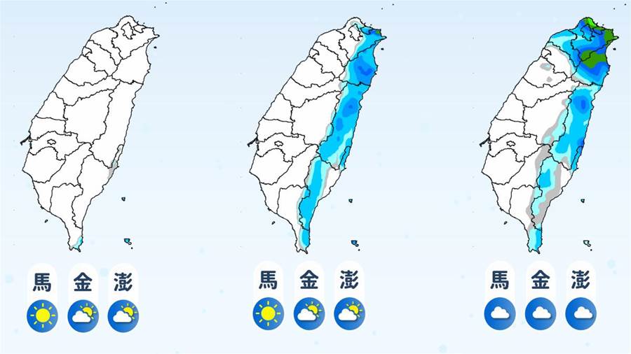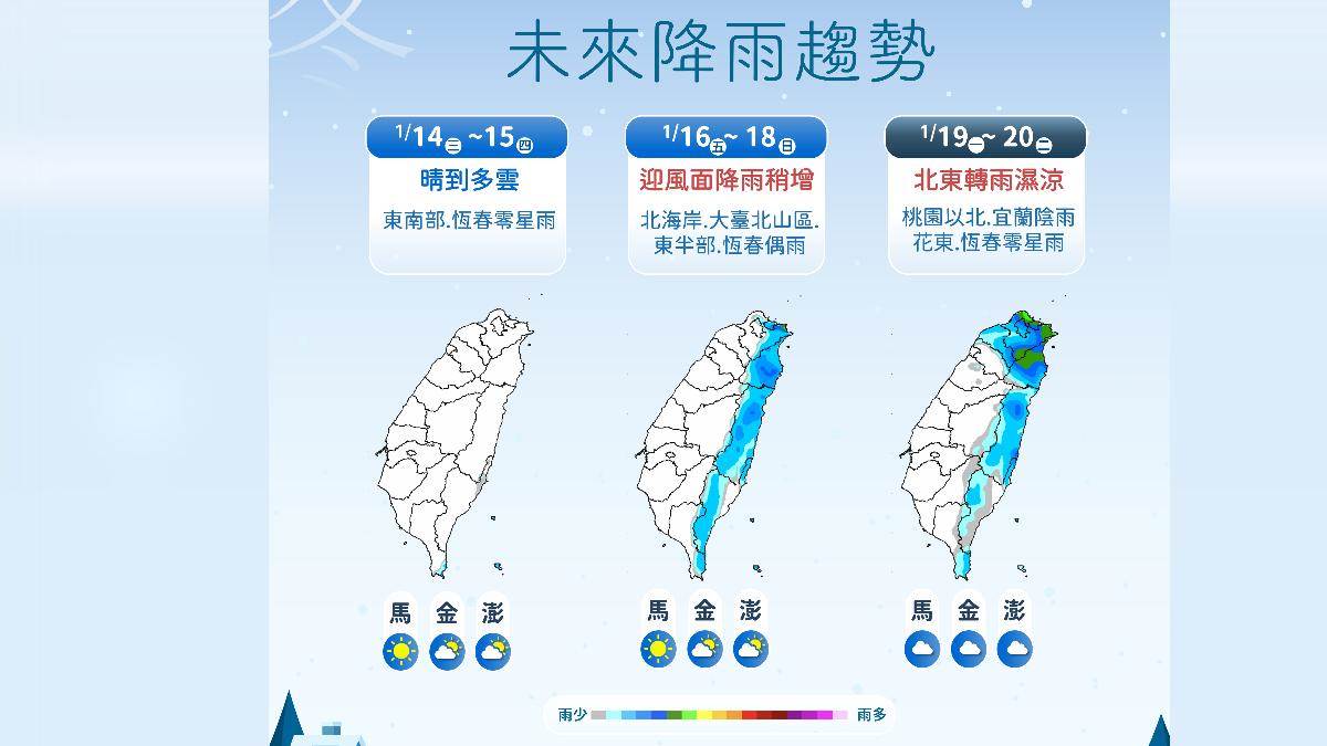 降雨部分,朱美霖說今天到明天晴到多雲,東南部、恆春半島零星降雨,週五到週日,尤其週末迎風面降雨增多,大臺北山區、基隆北海岸、東半部有下雨狀況,其他各地多雲到晴,週一、週二變天,週一東北季風影響,週二冷氣團南下,迎風面桃園以北、東半部都會有區域性降雨,尤其基隆北海岸、宜蘭、桃園以北降雨狀況持續。