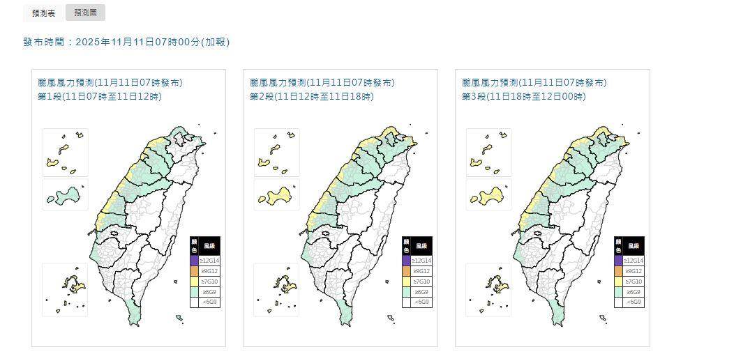 新北市濱海鄉鎮 平均風7級 陣風10級 桃園市濱海鄉鎮 平均風7級 陣風10級 新竹市濱海鄉鎮 平均風7級 陣風10級 新竹縣濱海鄉鎮 平均風7級 陣風10級 苗栗縣濱海鄉鎮 平均風7級 陣風10級 台中市濱海鄉鎮 平均風7級 陣風10級 彰化縣濱海鄉鎮 平均風8級 陣風11級 雲林縣濱海鄉鎮 平均風8級 陣風11級 連江縣 平均風7級 陣風10級 金門縣 平均風7級 陣風10級 澎湖縣 平均風8級 陣風11級