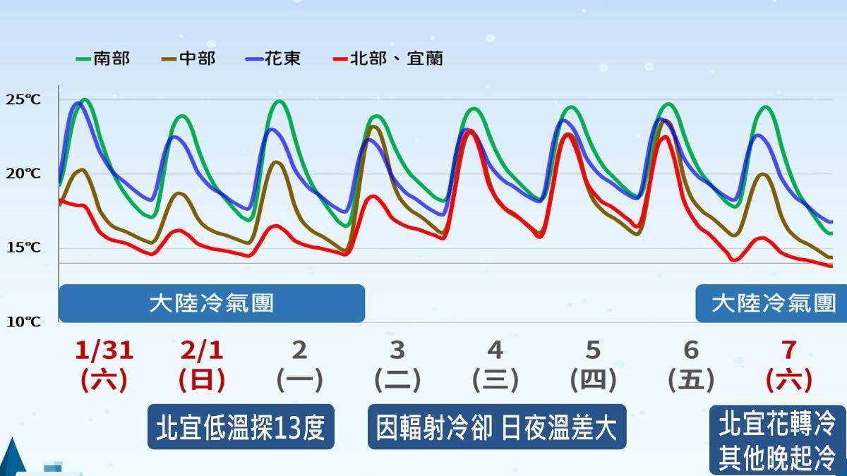 吳德榮進一步指出,最新模式模擬顯示,週三至週五(4至6日)大陸冷氣團逐日減弱,各地白天轉晴暖舒適,早晚氣溫低,日夜溫差很大。因夜間輻射冷卻,部分縣市有10度以下的平地最低氣溫。這波冷氣團雖不是很強,但帶來冷、暖交替變化及日夜溫差大的特徵,應注意衣著調整。