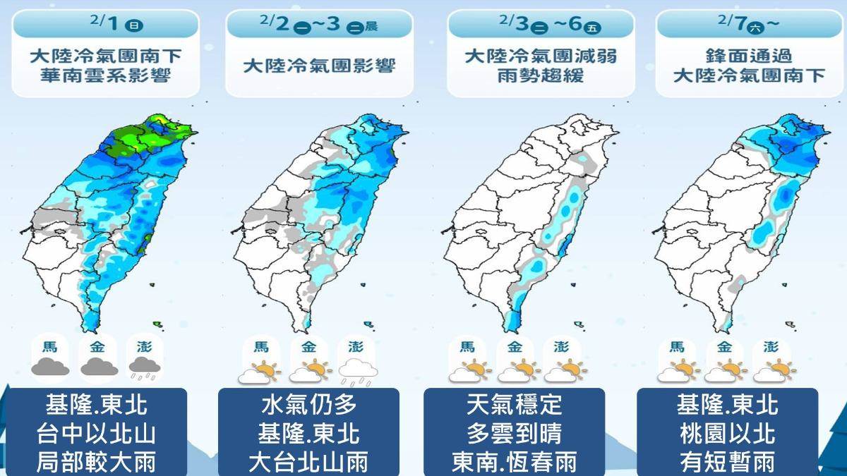 今(1日)持續受陸冷氣團影響,中部以北及宜蘭有廣泛的降雨,尤其基隆北海岸、宜蘭和臺中以北山區則是區域性較大雨勢,各地低溫約13至18度,北部感受較為濕冷。氣象專家吳德榮提醒,這週短暫回暖後再變天,又一波強冷空氣來襲。