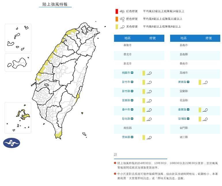 由于東北風顯著增強,氣象署針對全臺共10個縣市發布陸上強風特報,此波警報將從27日晚間持續至28日晚間。受影響區域包含桃園市、新竹市、新竹縣、苗栗縣、臺中市、彰化縣、雲林縣、屏東縣、臺東縣及澎湖縣。