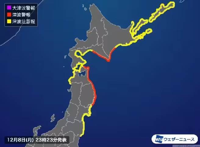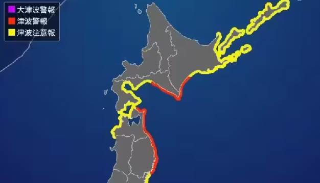 當地時間11點33分左右青森縣東方海域再次發生最大震度5.6地震,最大震度3。青森、北海道離岸已確實觀測到海嘯,正快速襲向陸地。日本當地時間23點40分,北海道浦川町預計會出現三米高的海嘯,惠裡茂鎮和十勝港分別在23點50分,以及9日凌晨12點也會出現3米高的海嘯。日媒指出海嘯可能造成災害。在沿海地區或河川沿岸的人,請立即疏散到高地或避難大樓等安全場所。海嘯可能多次襲來,請在警報解除前,不要離開安全地點。