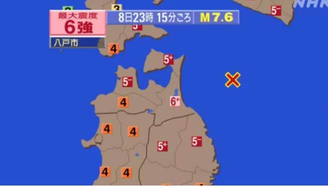 地震規模上修至7.6。(圖/翻攝NHK)日本青森縣外海在台灣時間 8 日晚間發生強烈地震。根據日本氣象廳資料,地震發生于當地時間 12 月 8 日晚間 11 點 15 分左右,震源位于 青森縣東方近海、距離八戶市東北東約 80 公里處,地震規模達 7.2,之後上修至7.6,震源深度約 50 公里,青森縣最大震度為 6 強,北海道也有五強跟五弱的震度,日本氣象廳針對青森縣太平洋沿岸、巖手縣,以及北海道太平洋沿岸中部發布海嘯警報。
