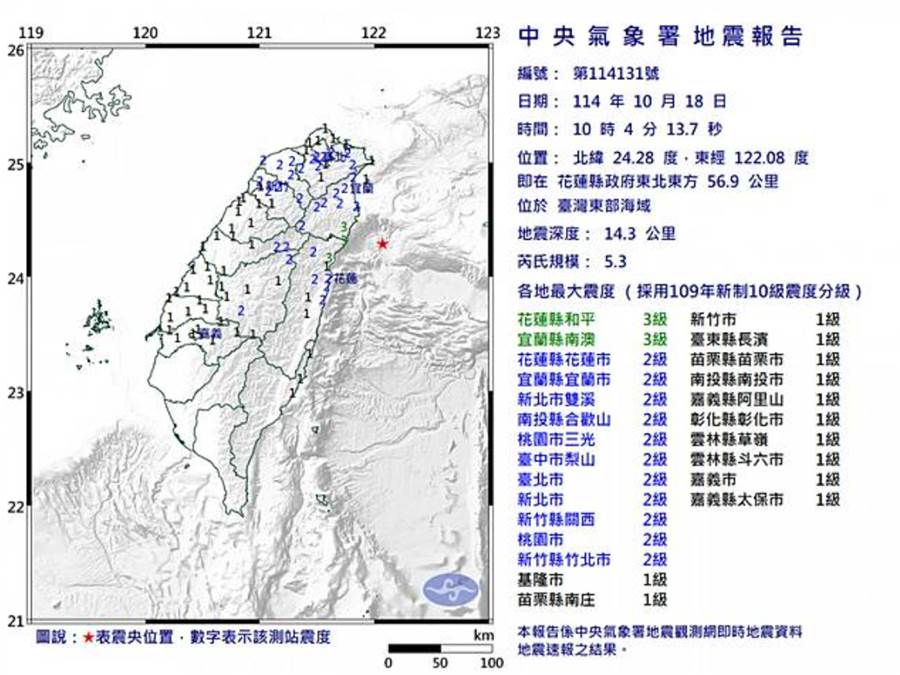 根據測報資料,震度3級地區為花蓮縣、宜蘭縣;震度2級地區包括新北市、南投縣、桃園市、台中市、台北市及新竹縣;震度1級地區則涵蓋基隆市、苗栗縣、新竹市、台東縣、嘉義縣、彰化縣、雲林縣與嘉義市。