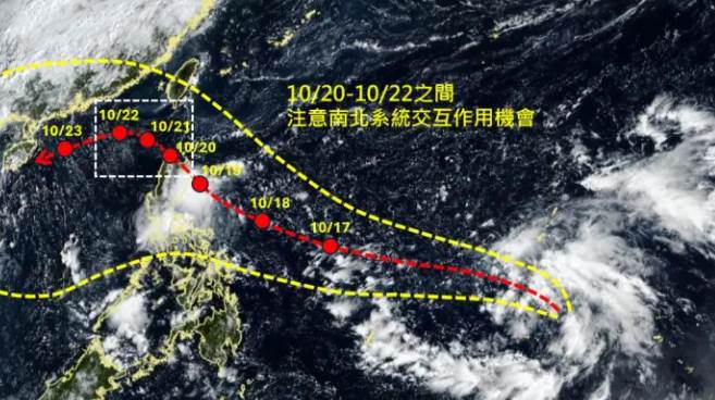 至于風雨最劇烈的時段,會落在週日下半天至下週三期間,颱風外圍暖溼氣流與東北季風在台灣東側、東北側交會,產生共伴效應,發展出大量雲雨帶,北部、東部、恆春、南屏東容易下雨,尤其「基隆北海岸、台北東側、北部山區、宜蘭、花蓮」,高機率出現持續性的大雨或強降雨,