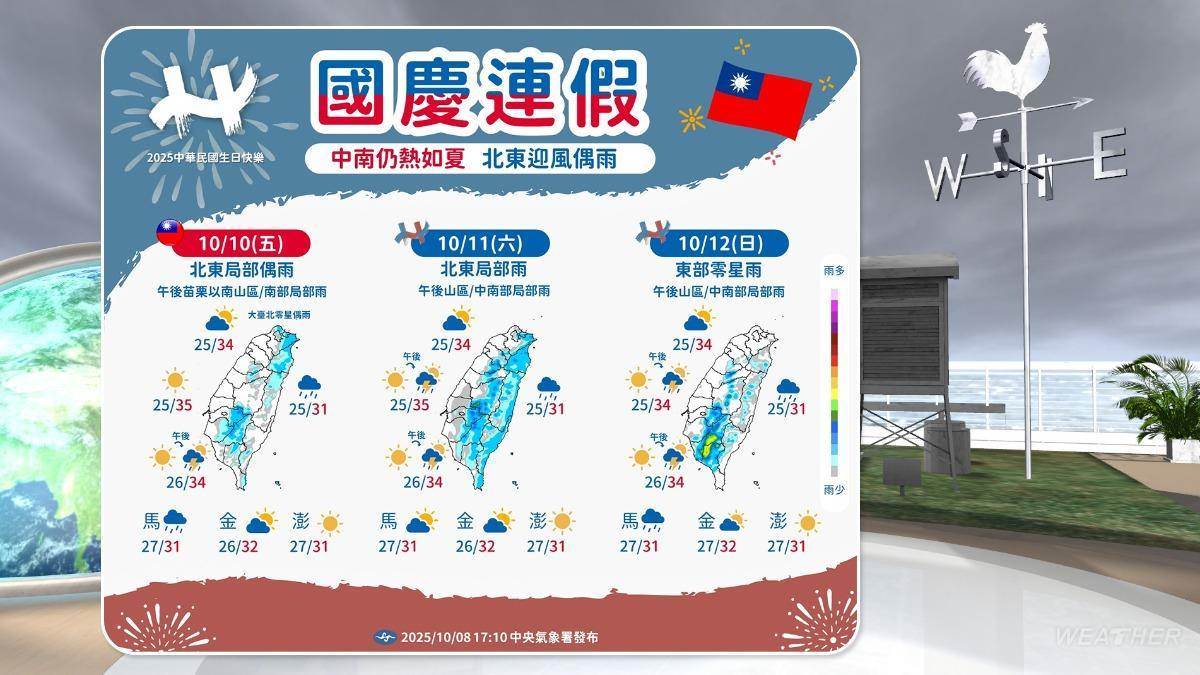 賈新興在臉書及YouTube頻道「Hsin Hsing Chia」表示,國慶連假大致午後零星短暫雨,明(10日)受微弱東北季風影響的機率,北海岸至宜蘭有零星短暫雨,午後各地山區有零星短暫雨。週六(11日)東北季風減弱,午後各地山區有零星短暫陣雨。週日(12日)午後桃園至台中、高屏及宜蘭有零星短暫陣雨。