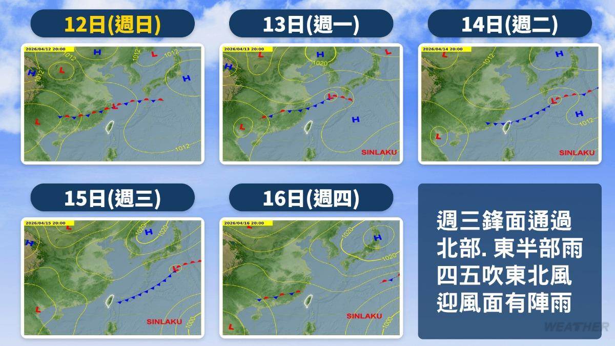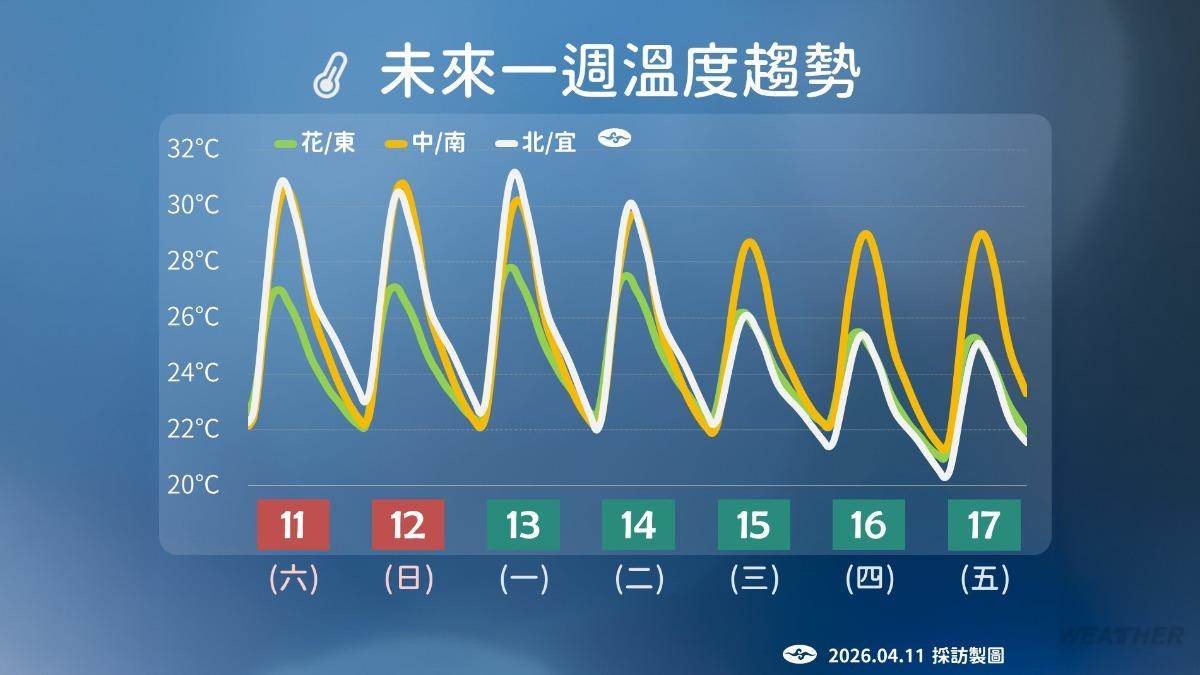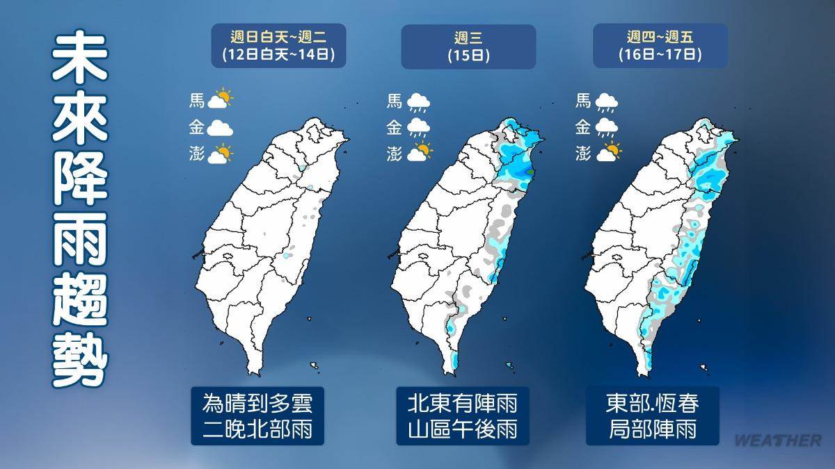 吳德榮續指,到了週三至週四(15至16日),微弱鋒面將在北部海面徘徊,北台灣高溫微降,但各地整體溫度仍偏暖熱,大多維持多雲到晴的天氣。不過,北台灣偶爾受鋒面邊緣影響,有局部短暫降雨的機率。