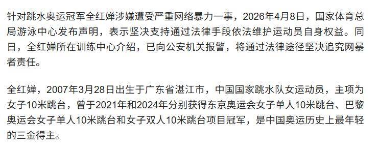 今年4月8日,針對全紅嬋涉嫌遭受嚴重網絡暴力這件事情,國家體育總局游泳中心發布了一份聲明。