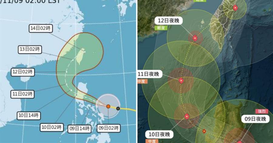 氣象署說明,週三前後颱風將最接近台灣,颱風中心逐漸接近西半部地區,在中南部、花東部地區有陣雨,並有大雨或區域性豪雨發生的機率,北部及東北部地區有短暫陣雨;週四(13日)隨著颱風逐漸減弱並遠離,降雨強度將會趨緩,中部以北、東北部地區及恆春半島有短暫陣雨,其他地區亦有區域性短暫陣雨。