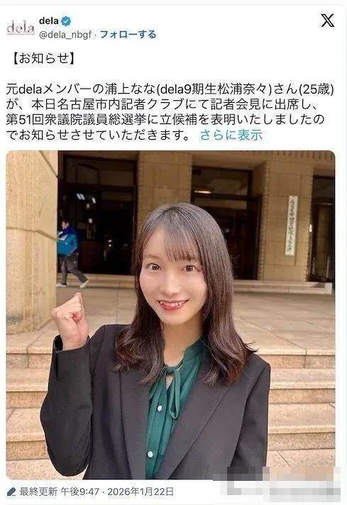 浦上奈奈的記者會結束后,官方「dela」賬號也發布了一條消息。「我們謹此通知各位,前dela成員浦上奈奈(dela第9期成員松浦奈奈,25歲)今日在名古屋市新聞俱樂部出席記者會,宣布將參加第51屆眾議院選舉。」