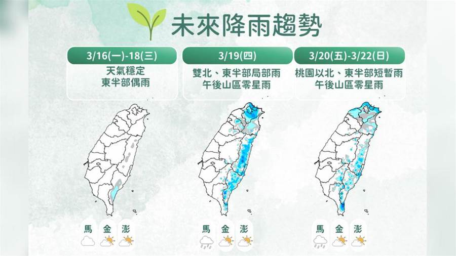 降雨趨勢方面,週三之前各地水氣偏少,僅東半部偶有零星雨。週四鋒面接近後,雙北及東半部地區將出現區域性短暫陣雨,山區也可能有午後零星降雨。週五起桃園以北及東半部水氣增多,山區降雨機率也提高。