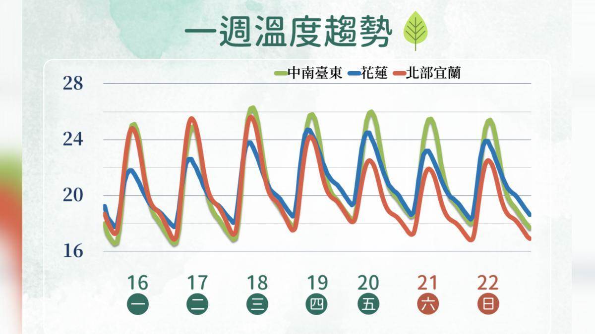 氣溫方面,未來一週整體仍偏溫暖,但需留意日夜溫差。週四起隨著降雨增加,北部氣溫略為下降,體感轉為偏涼;未降雨時段則仍維持溫暖。