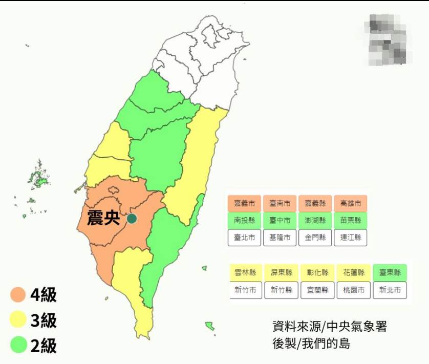 氣象署指出,這次地震最大震度在嘉義大埔 、高雄桃源、臺南楠西等地區達到4級,其餘中南部地區則是2級以上震度。初步判斷地震發生原因為菲律賓海和歐亞板塊,兩個板塊相互碰撞所引起,菲律賓海板塊向北隱沒,歐亞板塊向南隱沒,震央位置剛好位于兩個隱沒轉向的地方,所以造成這地區的地震比其他地區還多。