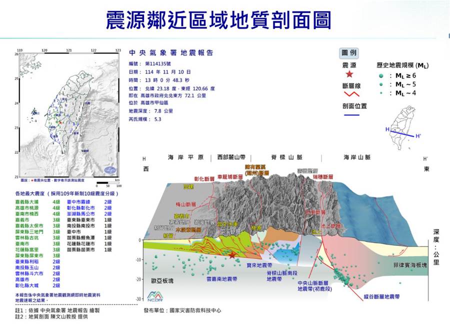 今天下午一點,高雄市甲仙區發生芮氏規模5.3地震,深度7.8的極淺層地震,氣象署針對雲嘉南四個縣市發布國家級警報,並在下午舉辦記者會說明。