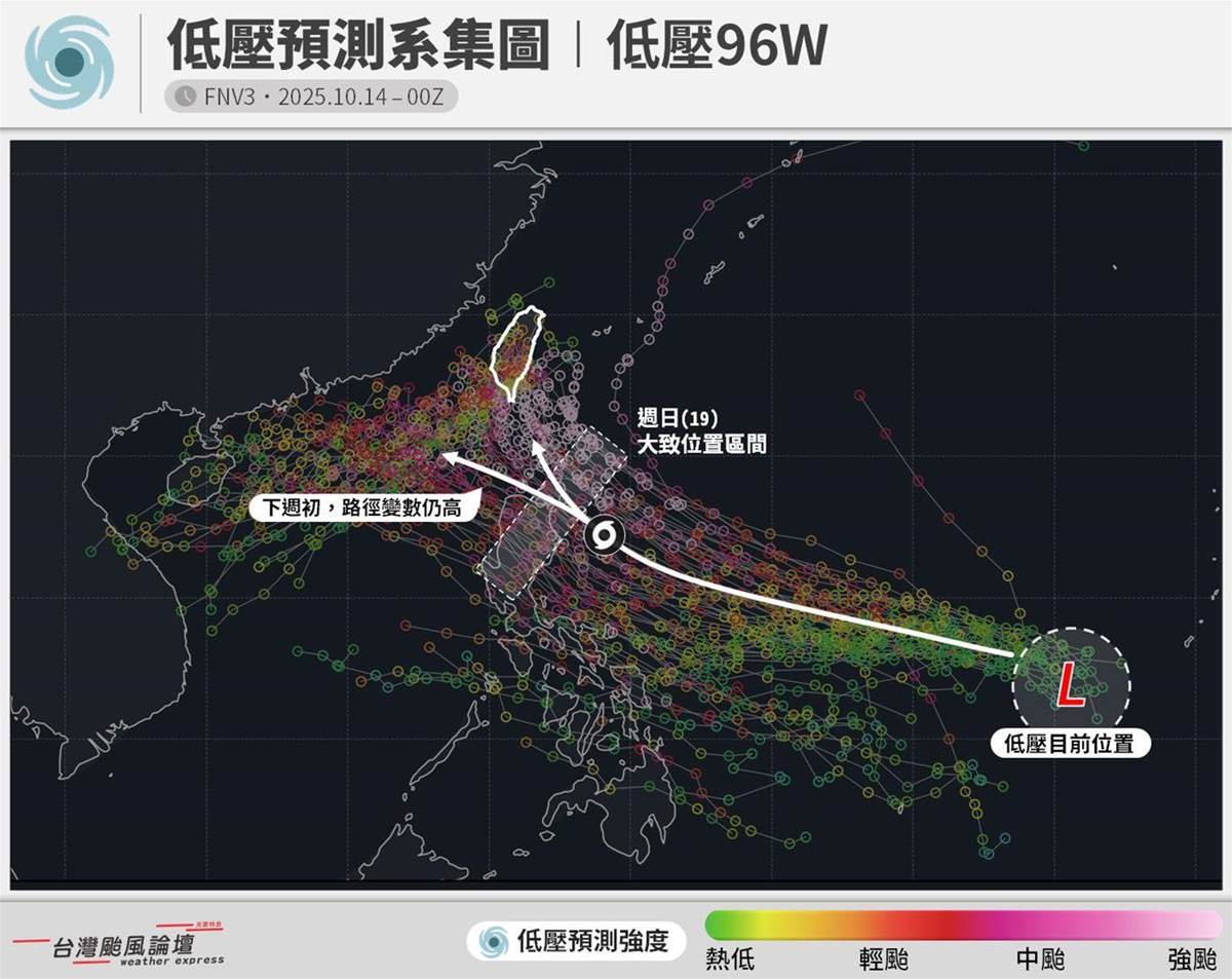 風神颱風原本路徑預測通過巴士海峽,豈料北修了!氣象粉專「台灣颱風論壇|天氣特急」分析,週日前低壓大方向算穩定報往菲東,但之後預測路徑就是「天女散花」!