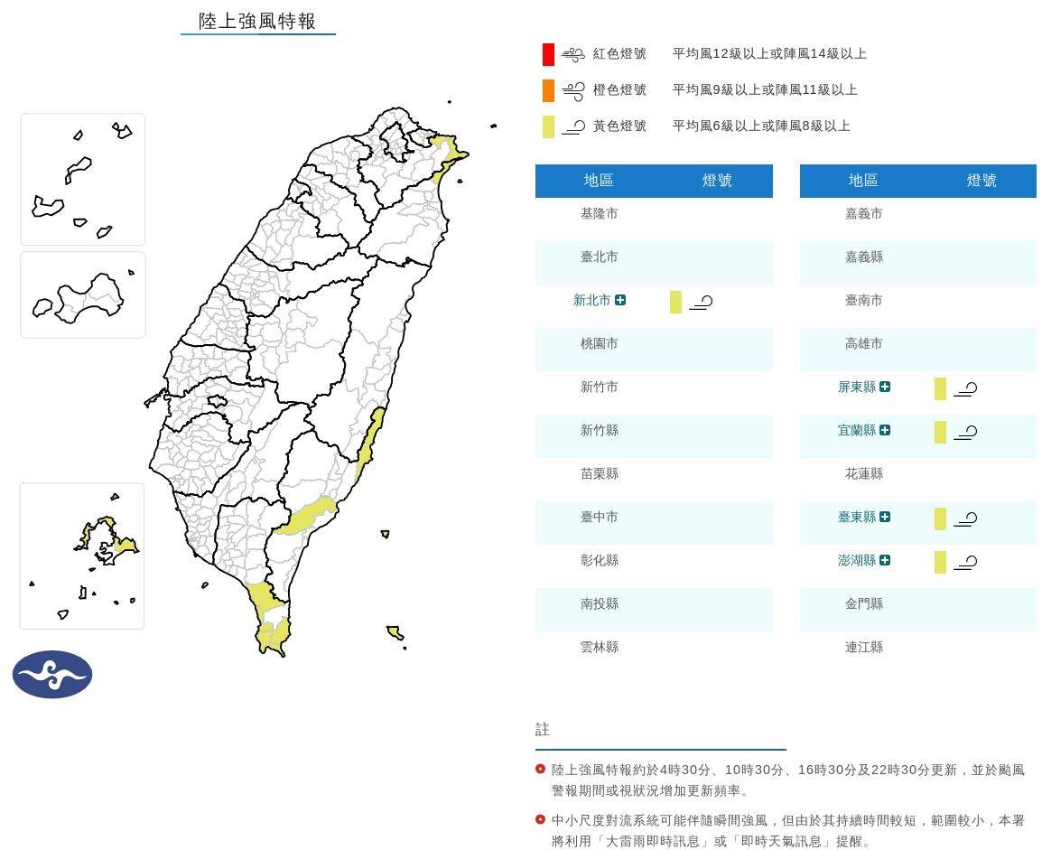 新北市、屏東縣、宜蘭縣、臺東縣及澎湖縣等五個縣市,于1日下午至2日晚間被列入陸上強風特報黃色燈號警戒范圍。(圖/氣象署)