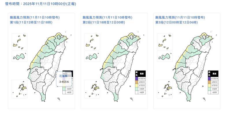12日0時至12日6時風力達標:新北市濱海鄉鎮、苗栗縣濱海鄉鎮、台中市濱海鄉鎮、彰化縣濱海鄉鎮、雲林縣濱海鄉鎮、連江縣、澎湖縣