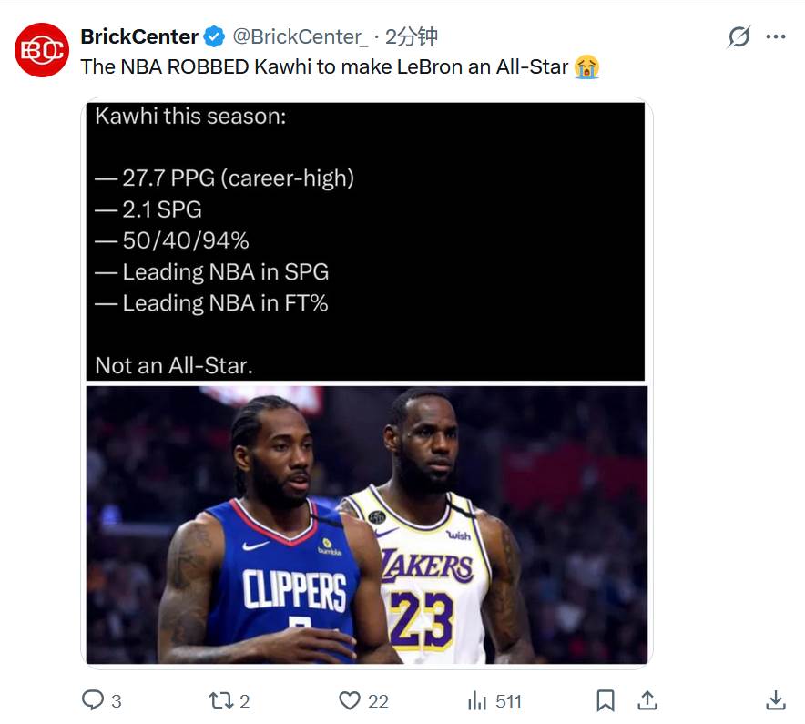著名媒體BrickCenter更是直言:萊昂納德的全明星被詹姆斯搶劫了!