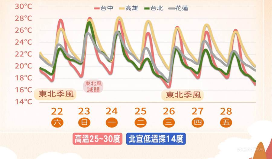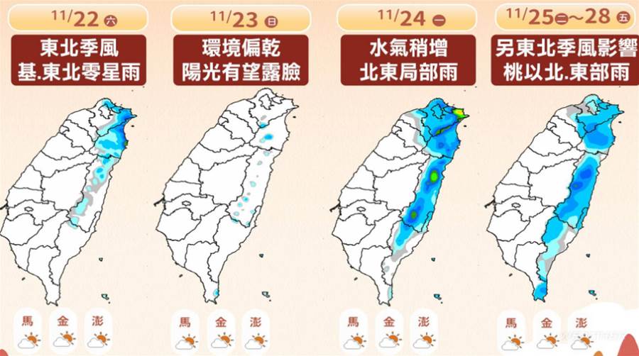 不過好天氣持續不久,週二(11/25)晚起,新一波東北季風開始南下,北部及東北部地區將再度轉為先濕冷、後乾冷,低溫預測將下探至攝氏15至16度,全天體感降溫明顯;中部及花蓮地區低溫也僅剩攝氏17至18度左右,南部地區低溫也降到攝氏20度上下,民眾請多留意氣溫劇烈變化。