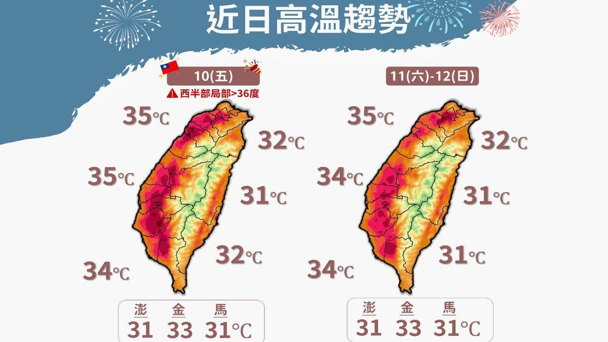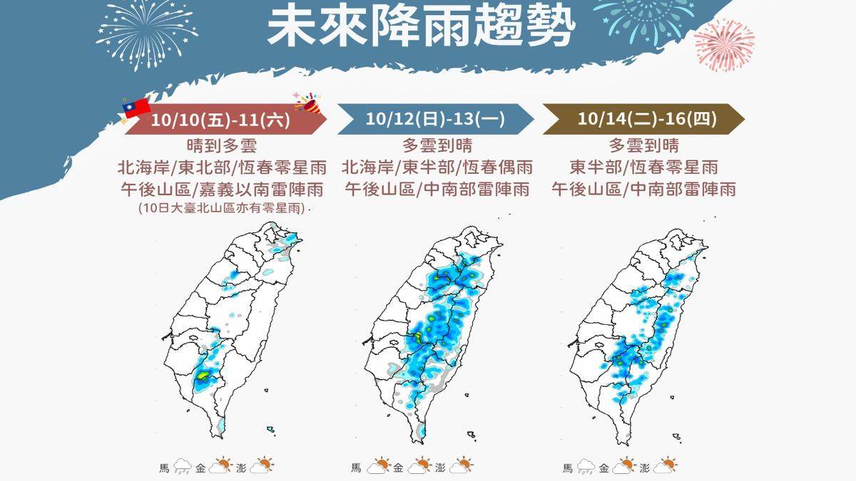 「天氣風險 WeatherRisk」補充,未來一週太平洋高壓籠罩,全台皆是晴時多雲、山區午後局部雷陣雨,白天高溫上看33至35度,但20日後可能會有一波較強的東北季風挾帶水氣南下,迎風面的東北部不排除出現較大雨勢,且北部、東北部低溫恐下探20度。不過,該粉專也特別提醒,由于這是10天後的預報,仍有不少變數,詳細情況仍有待後續觀察。
