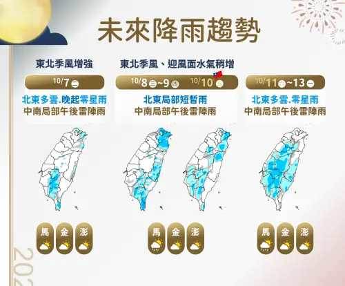 ,其他地區為多雲到晴,午後中南部、山區有局部短暫雷陣雨。連假第一天降雨相對較多。週六至下週一(10/11至10/13)環境風場轉為偏東風,基隆北海岸、東半部地區、大台北山區、恆春半島仍有零星短暫陣雨,其它地區為多雲到晴,午後中南部地區及其他山區有局部短暫雷陣雨。