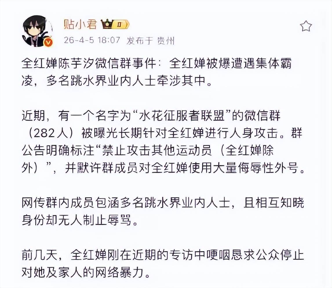 公安部網安局正式通報,群主徐某多次在群內,惡意發表針對全紅嬋的侮辱性言論。