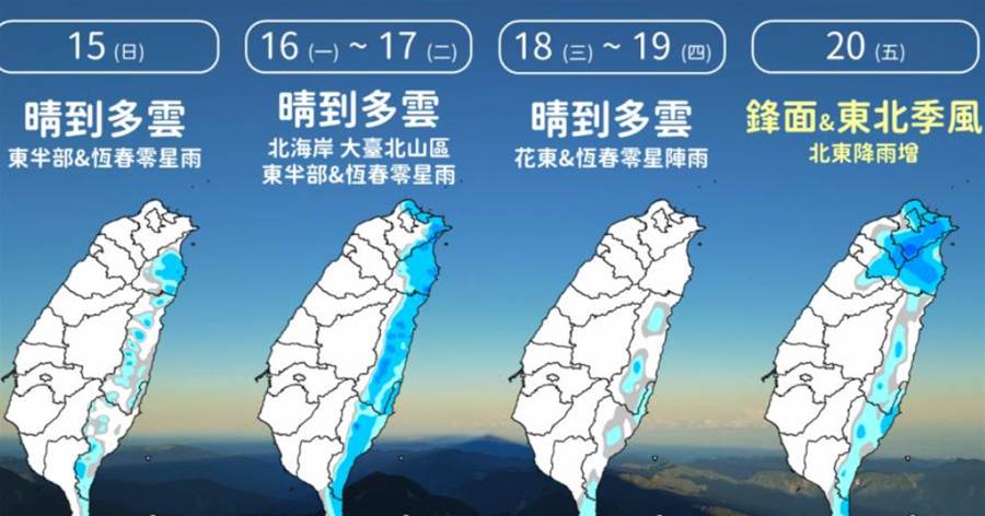 出門帶傘!根據中央氣象署最新天氣預報,今(28)日鋒面通過及東北季風增強,台灣中部以北以及宜蘭、花蓮地區有局部短暫陣雨或雷雨,並有局部較大雨勢發生的機率。