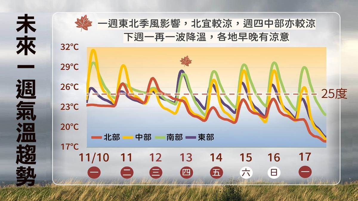 不過值得注意的是,下週一(17)預計有更強的東北季風要下來,溫度下降的幅度應該會再加大,秋冬的感受可能又會更加明顯。