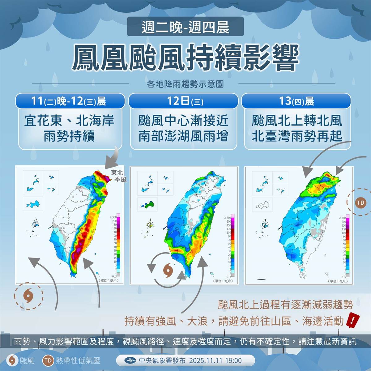 鳳凰颱風已減弱為輕度颱風,今(11)日清晨陸警、海警齊發,氣象粉專「天氣風險」指出,暴風圈預計明 (12)日逐漸籠罩嘉義以南、花東地區,白天七級風暴風半徑率先籠罩高屏地區,南部受暴風圈影響,雨勢開始增大。傍晚過後中心登陸,預計在週四(13)凌晨出海,並且應該已減弱為熱帶性低氣壓,同時颱風警報也可望跟著解除,但北部、東北部仍有較大雨勢,其他地區也有短暫雨,不過雨勢將逐漸趨緩。