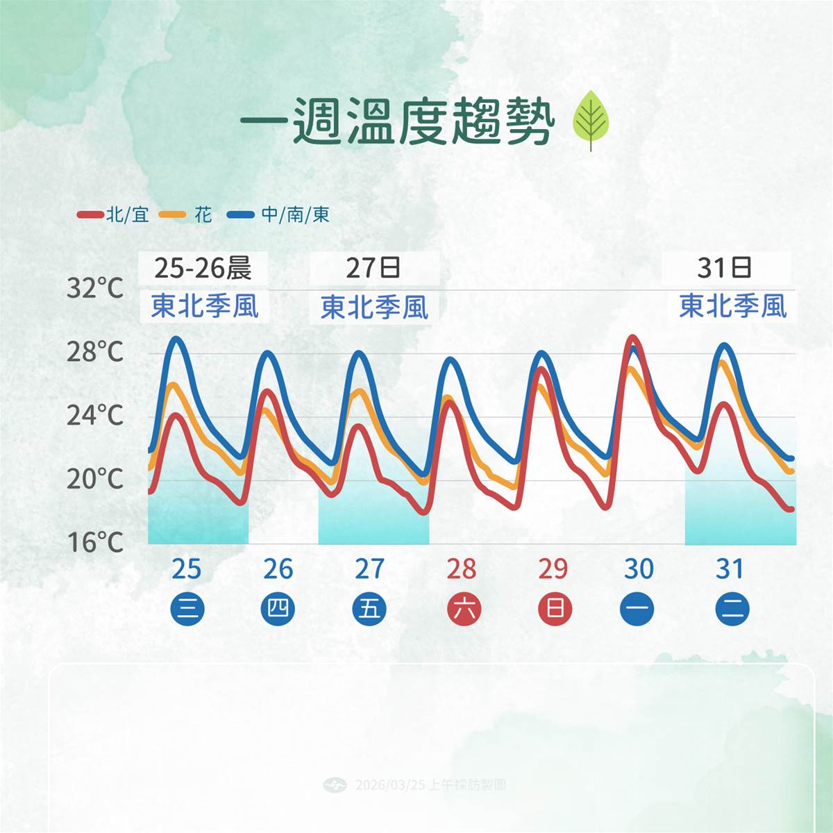 另一波強度更強的鋒面預計在下週二至周三通過,屆時降雨范圍將再度擴大。劉沛滕說明,中部以北及宜蘭地區都有出現區域性短暫陣雨或雷雨的機率。他也補充,三、四月本就是春雨好發的季節,從目前觀測來看,三月上旬雨量較多,但下旬至四月的降雨則可能偏少。