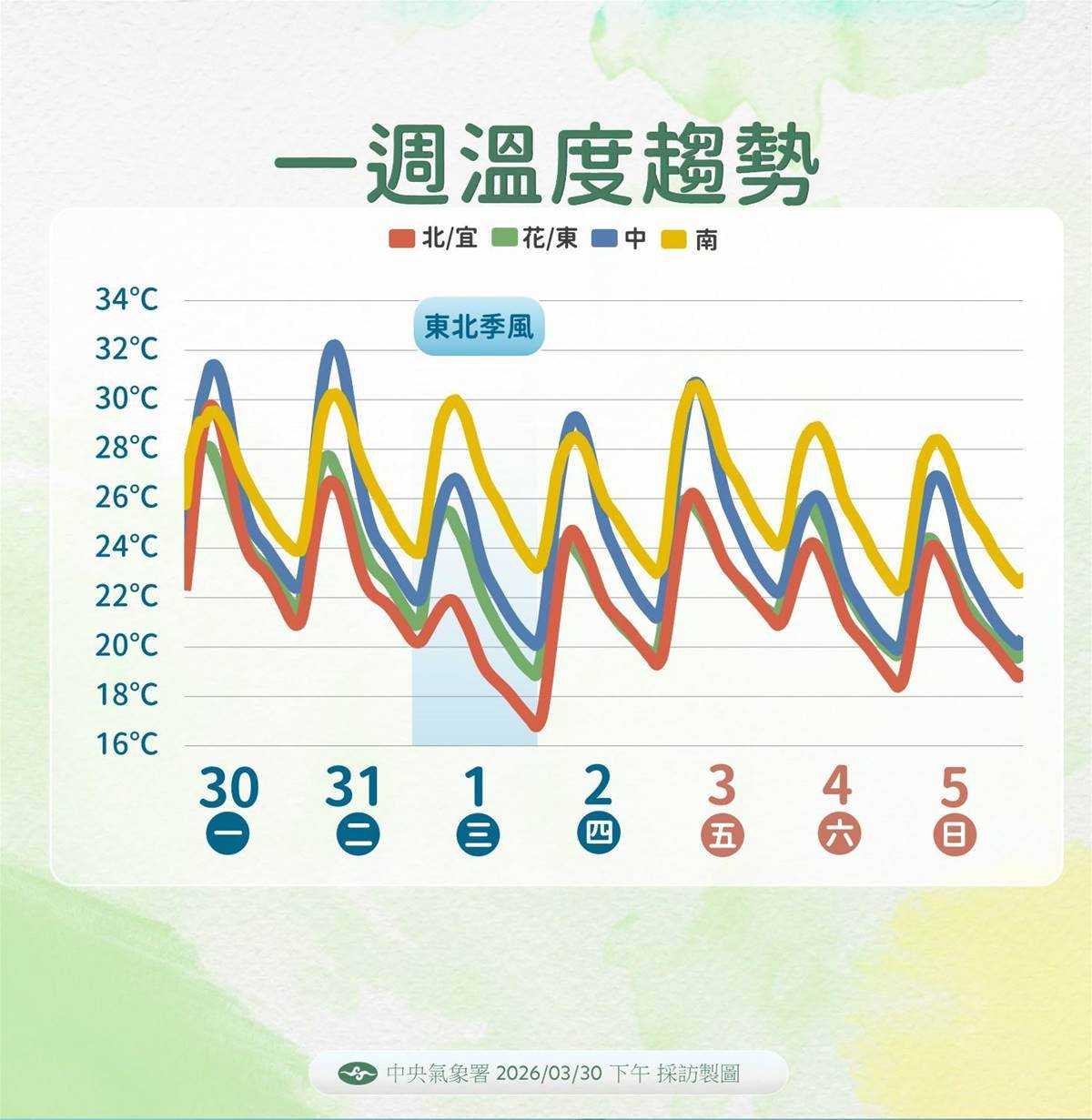 溫度趨勢上,3月31日高溫上看29度至33度,較溫暖炎熱,臺東需留意焚風發生。4月1日東北季風轉強,北台灣高溫降到22度至24度,低溫17度至18度,其他地區高溫26度至30度,南部變化相對較小。