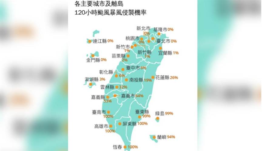 根據氣象署發布的120小時颱風暴風圈侵襲機率,基隆市0%、新北市0%、台北市0%、桃園市0%、新竹市1%、新竹縣1%、宜蘭縣1%、花蓮縣26%、台東縣99%、屏東縣100%、苗栗縣2%、台中市6%、彰化縣6%、南投縣19%、雲林縣32%、高雄市100%、嘉義市64%、嘉義縣53%、台南市100%、澎湖縣3%、金門縣0%、連江縣0%、蘭嶼94%、恆春100%、綠島99%。