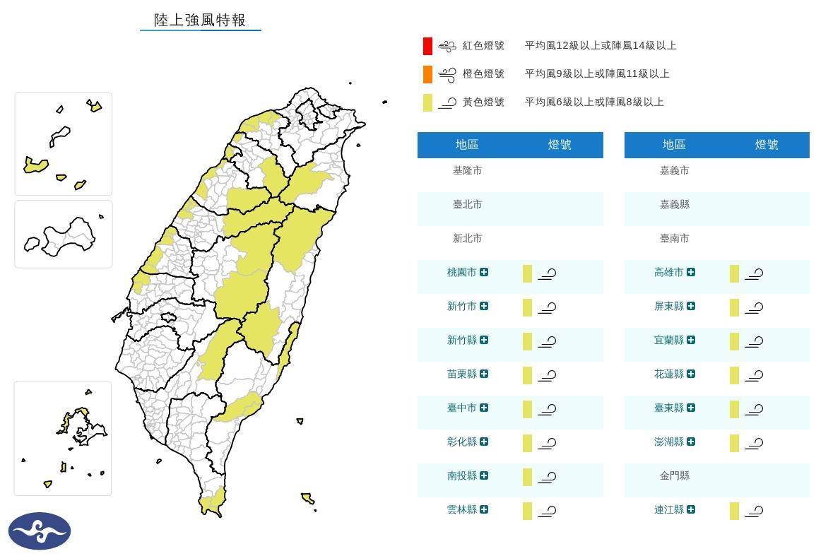 受鋒面透過及東北風增強影響,交通部中央氣象署于今(23)日下午16時31分正式發布強風特報(黃色燈號)。自今日下午起至明(24)日晚上,包含桃園、新竹、苗栗、臺中、南投、彰化、雲林、高雄、屏東、宜蘭、花蓮、臺東以及澎湖與連江等15個縣市,皆有機會出現平均風6級以上或陣風8級以上的強勁風力,提醒相關地區民眾務必提高警覺。