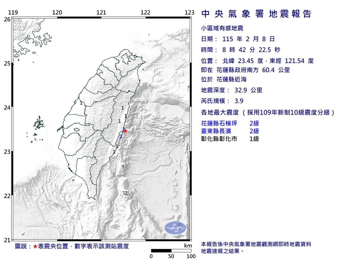 今天(8日)上午8點42分花蓮縣近海發生規模3.9地震,震央即在花蓮縣政府南方60.4公里,地震深度32.9公里,花蓮縣地區最大震度2級。才過短短2分鐘,上午8點44分雲林縣林內鄉又發生規模3.1地震,地震深度21.9公里,最大震度1級。