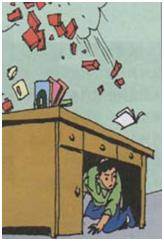 室內(居家、教室、辦公室) 立即躲到書桌、餐桌等堅固傢俱下方或旁邊,用軟物護頭。