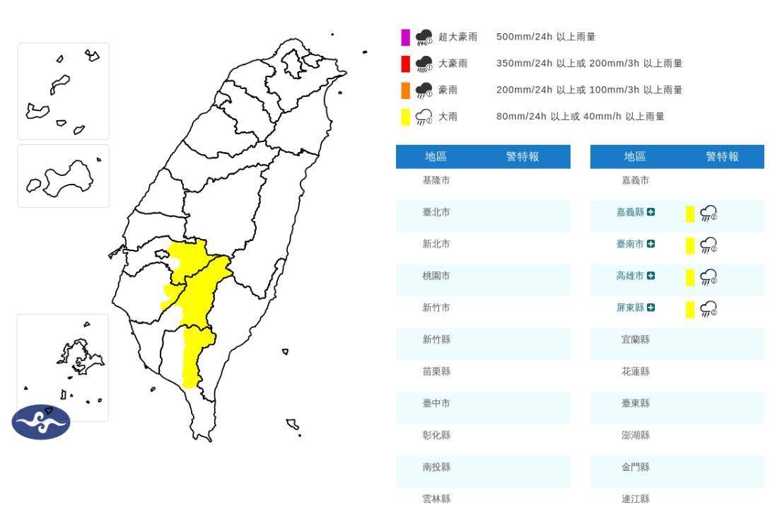 中央氣象署指出,嘉義以南山區有區域性大雨發生的機率,影響時間為21日下午至21日晚上,黃色燈號范圍包括嘉義縣山區、臺南市山區、高雄市山區、屏東縣山區。