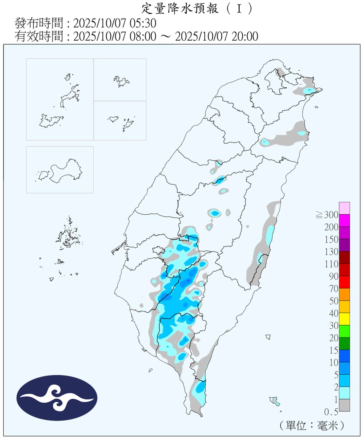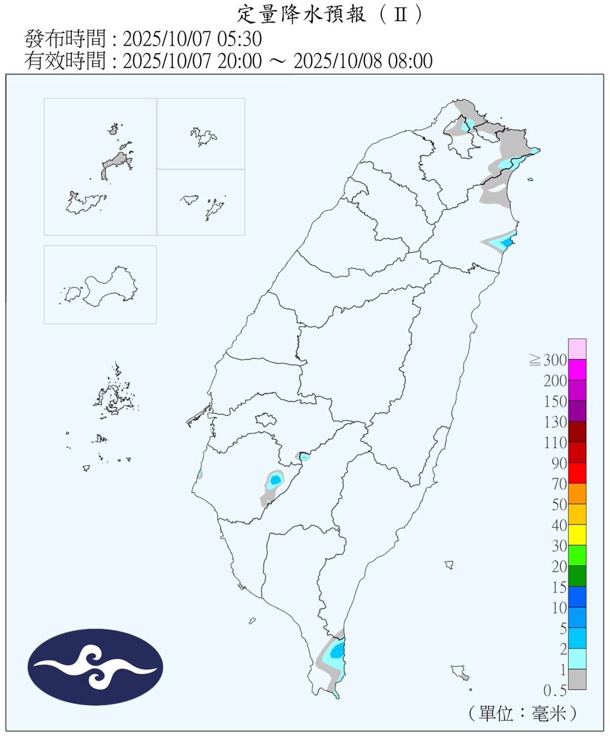 林定宜表示,周六到下周一偏東風,基隆北海岸、大台北山區、東半部、恆春半島有局部短暫陣雨,午後中南部、其他山區有局部短暫雷陣雨。